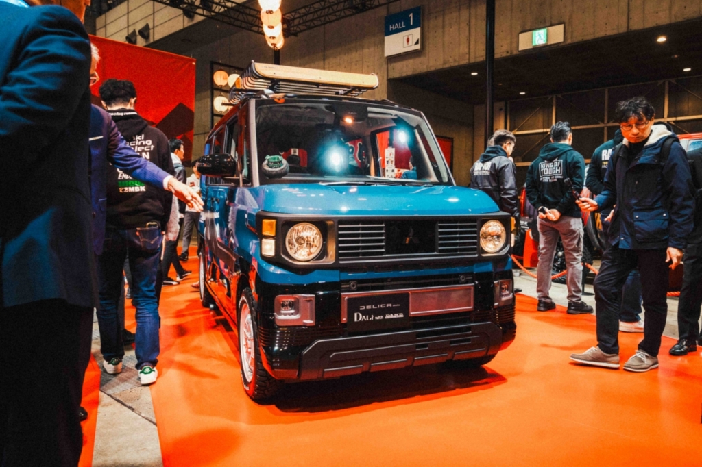 そのうちの1台。丸目の軽ハイトワゴンには人だかりができていた。スマートフォンを向ける来場者も多い。唯一、アフターパーツメーカーの名を冠したコンプリートカー「DELICA mini דDALI” with DAMD」、通称「デリカミニ・ダリ」である。いわゆるデリカミニのダムド・コン